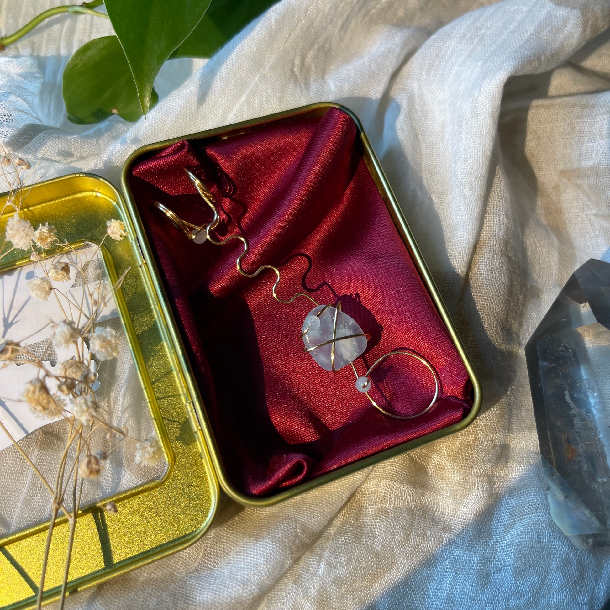 one of a kind aquamarine with an aquamarine accent bead to double its effects wrapped in tarnish resistant gold wire. each joint holder is fully adjustable to fit j's and blunts of any size. rings are adjustable to fit sizes 5-12. pairing your highs with this stunning crystal will bring forth its soothing, protective, and cleansing properties. each j holder comes with a hand crafted satin-lined tin so you can stash your j's and holders together on all your adventures