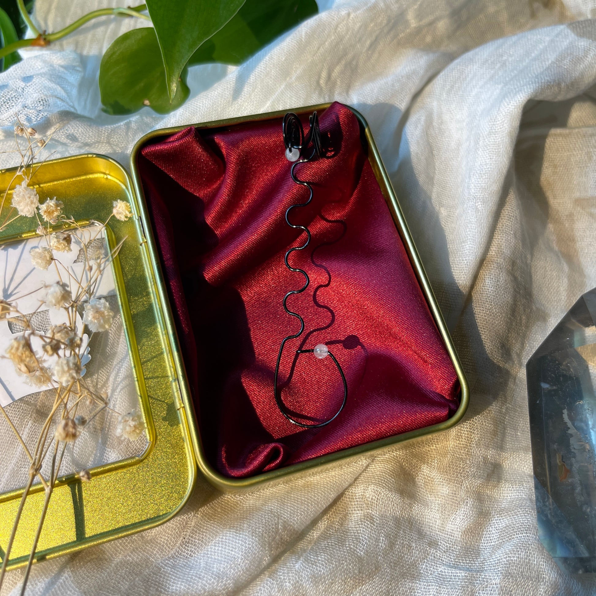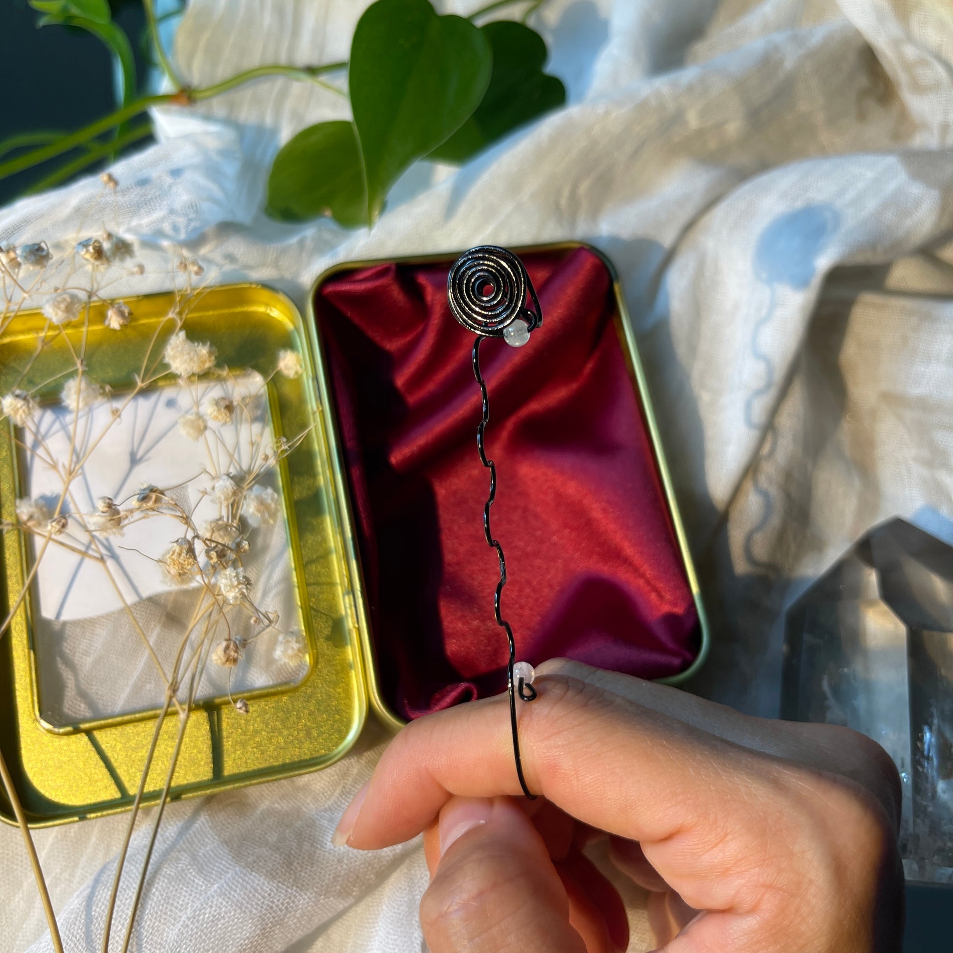 now introducing our brand new circe joint holder rings. each joint holder is fully adjustable to fit j's and blunts of any size. rings can be adjusted to fit sizes 5-12. fully customizable with four different wire selections & accented with aquamarine or morganite beads of your choice. each one is meticulously hand crafted and may differ ever so slightly from the last. each j holder comes with a hand crafted satin-lined tin so you can stash your j's and holders together on all your adventures