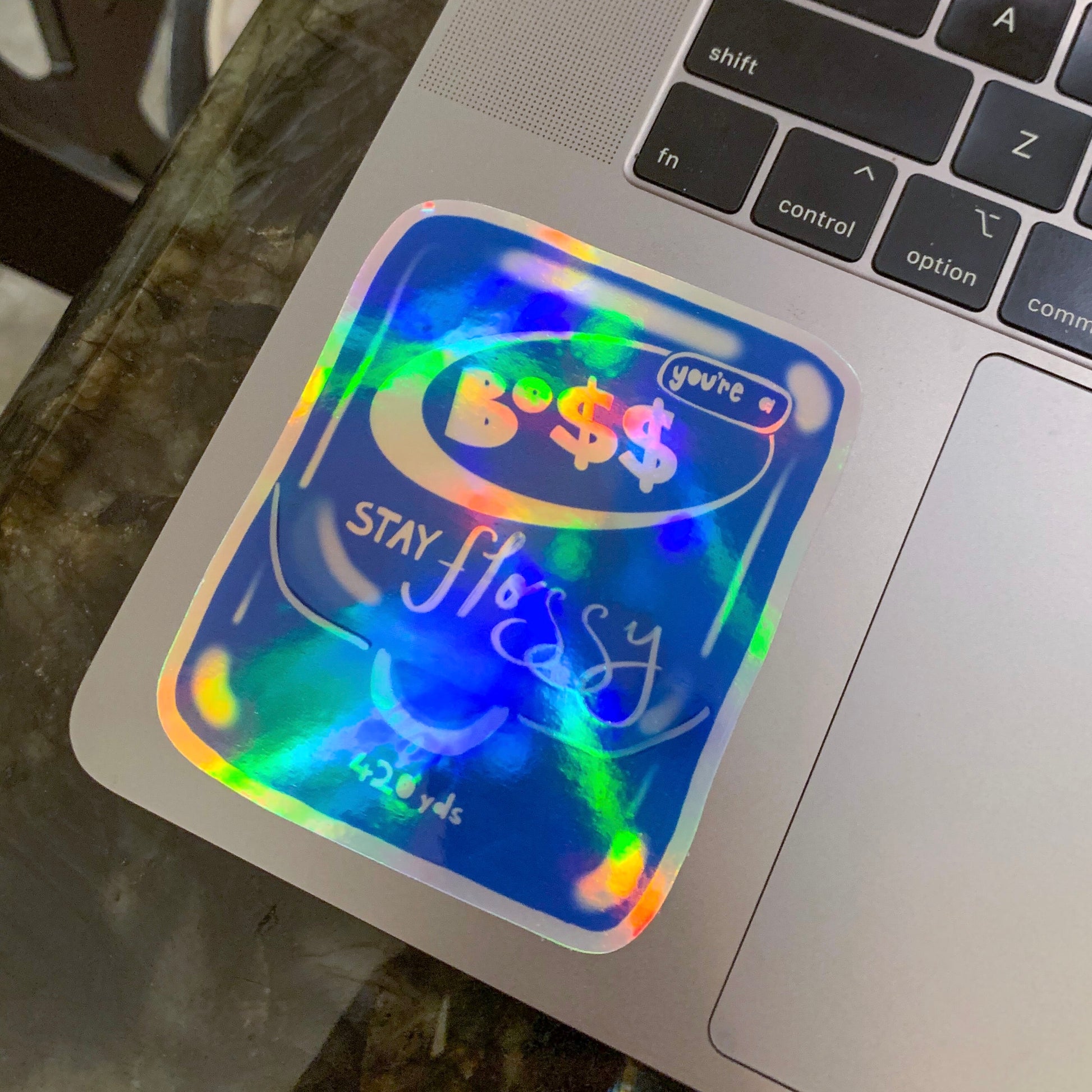 this piece features a holographic 3x3.5 inch vinyl sticker that is designed to be long-lasting and weatherproof.