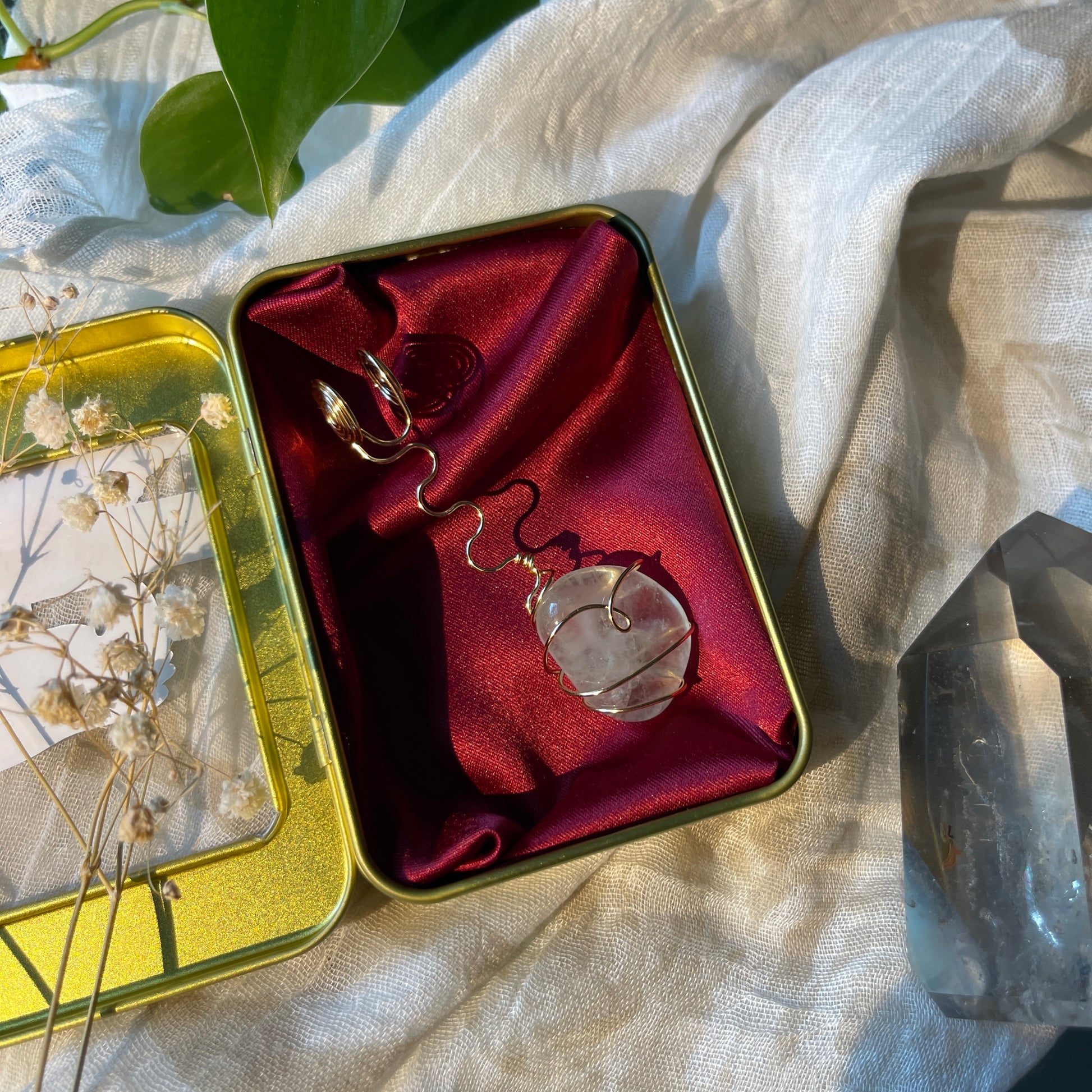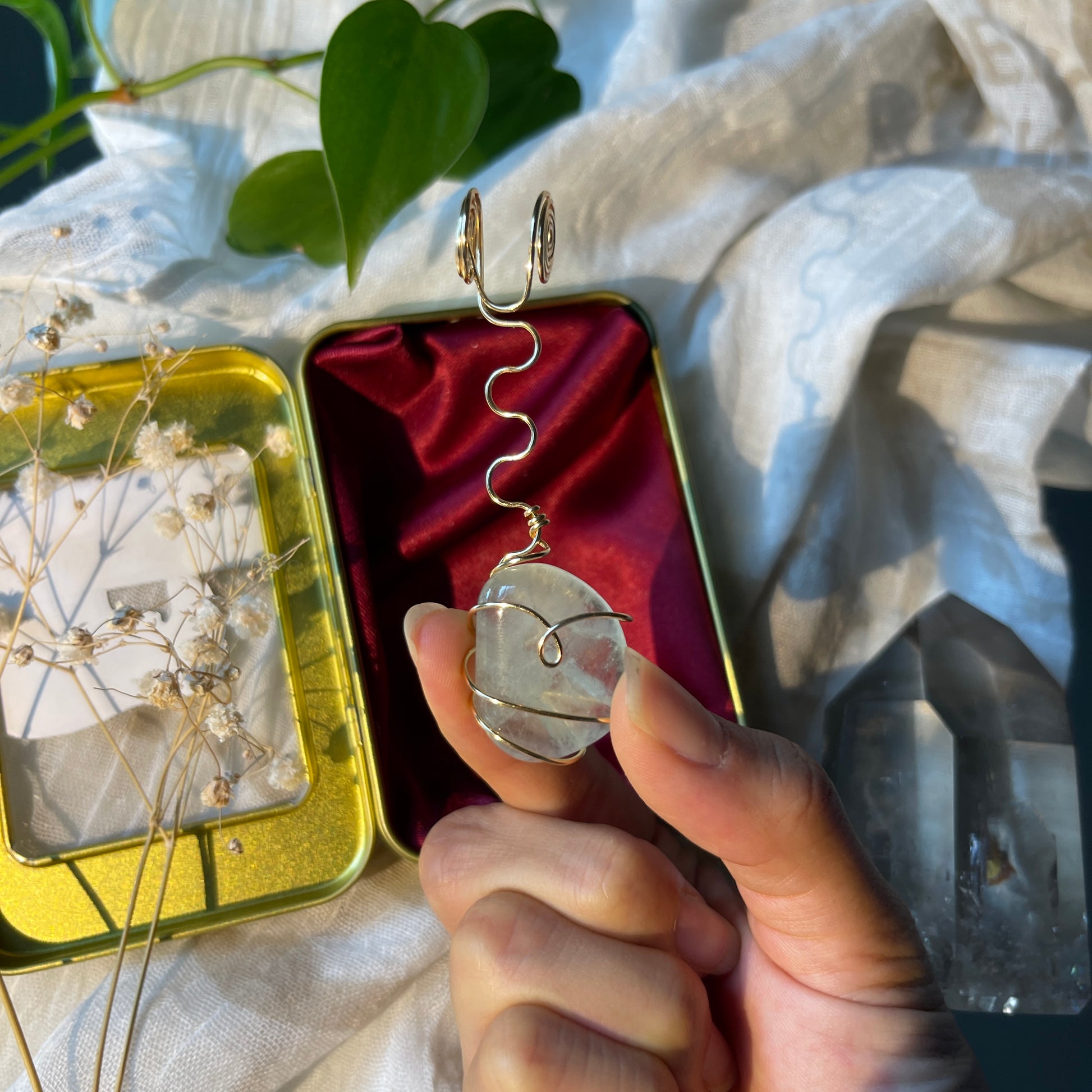 one of a kind high quality green fluorite tumble wrapped in tarnish resistant gold wire. each joint holder is fully adjustable to fit j's and blunts of any size. pairing your sessions with this fluorite will bring forth its calming and soothing properties. each j holder comes with a hand crafted satin-lined tin so you can stash your j's and holders together on all your adventures