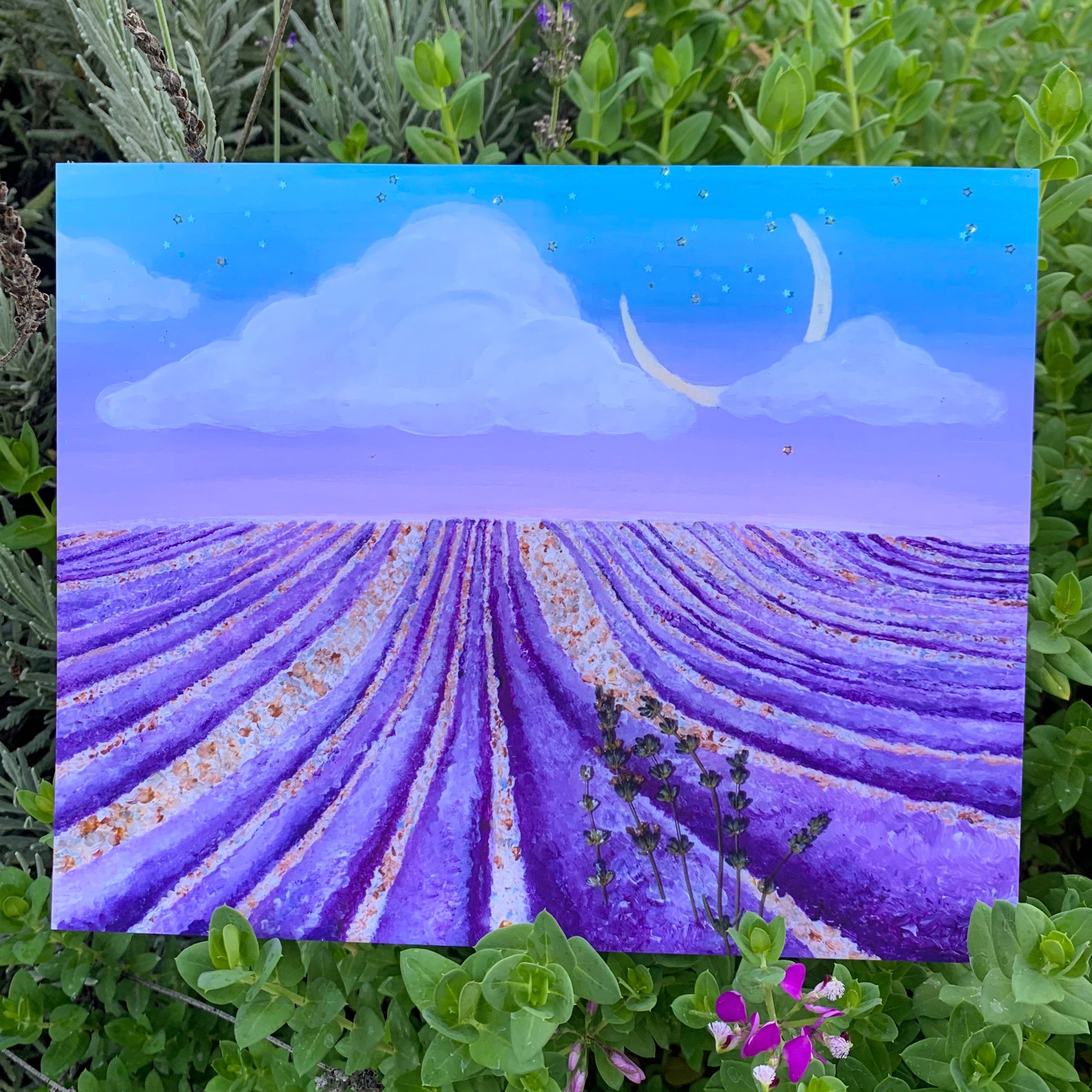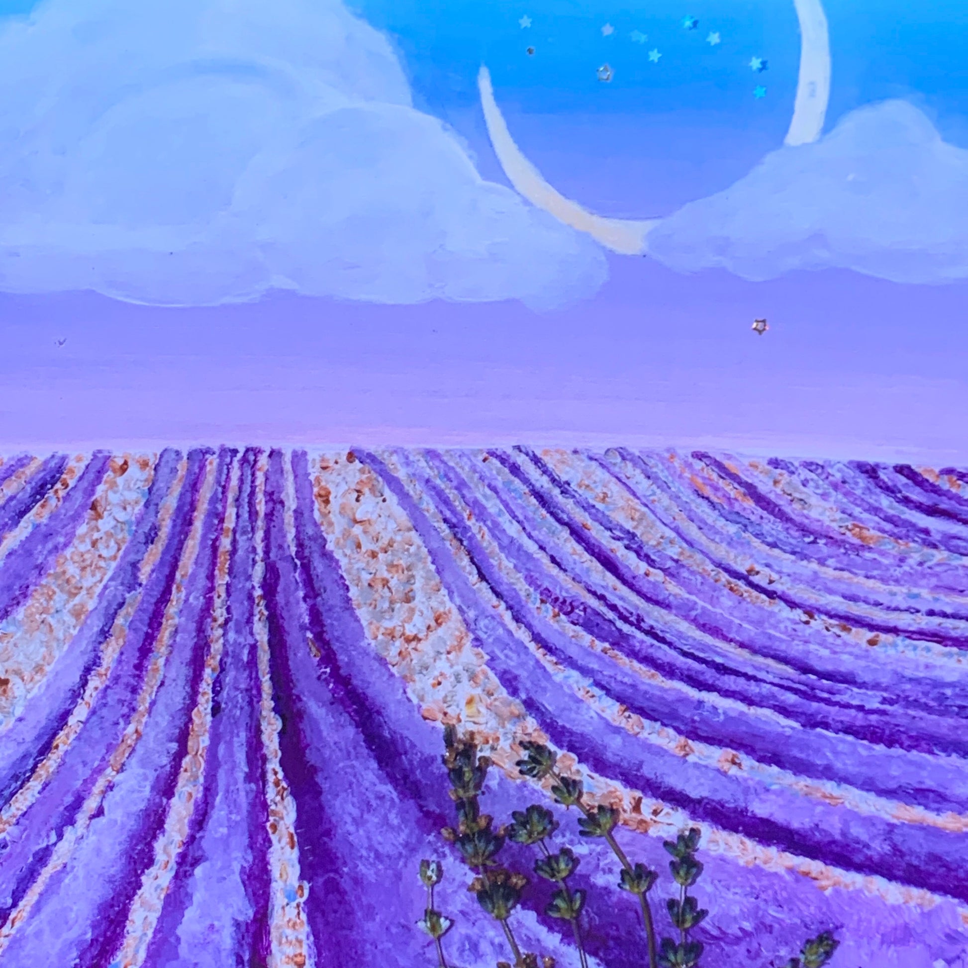 2020. acrylic on birchwood tray. this piece was inspired by the lavender fields in italy in france. painted in an impressionist style to capture the texture of the lavender bushes and pebbled ground.