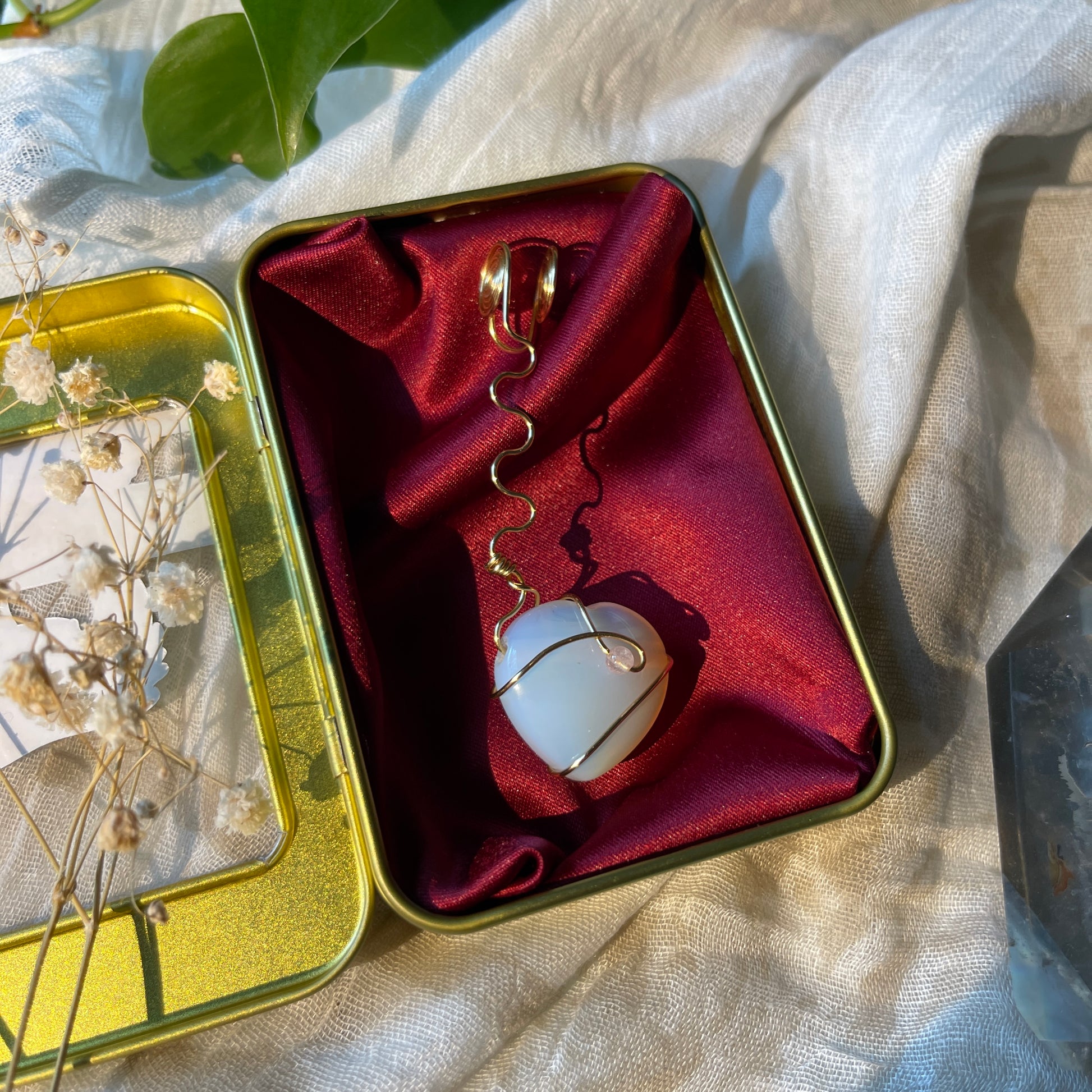 one of a kind opalite heart wrapped in tarnish resistant gold wire. each joint holder is fully adjustable to fit j's and blunts of any size. pairing your highs with this stunning crystal will bring forth its soothing and clarifying properties. each j holder comes with a hand crafted satin-lined tin so you can stash your j's and holders together on all your adventures