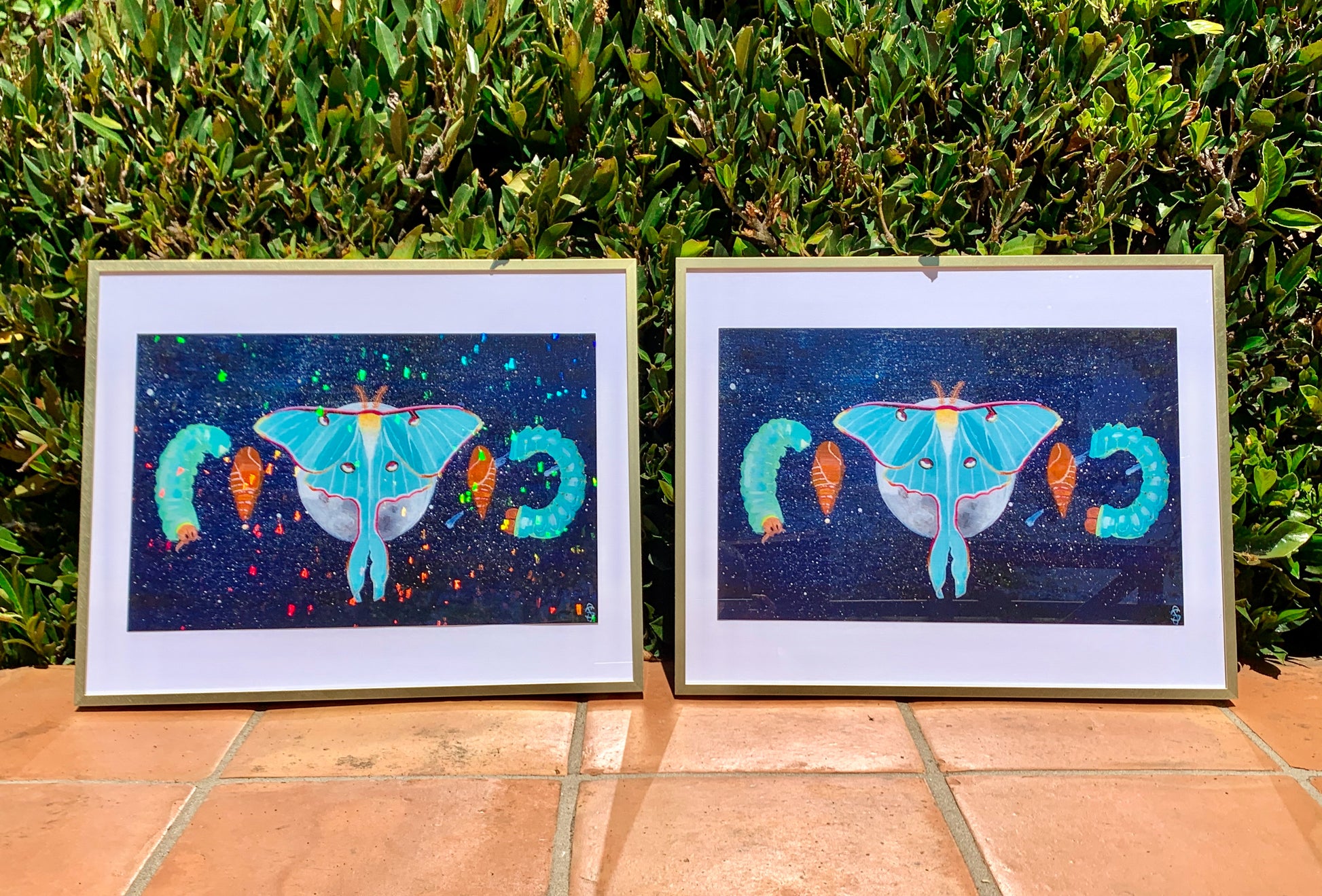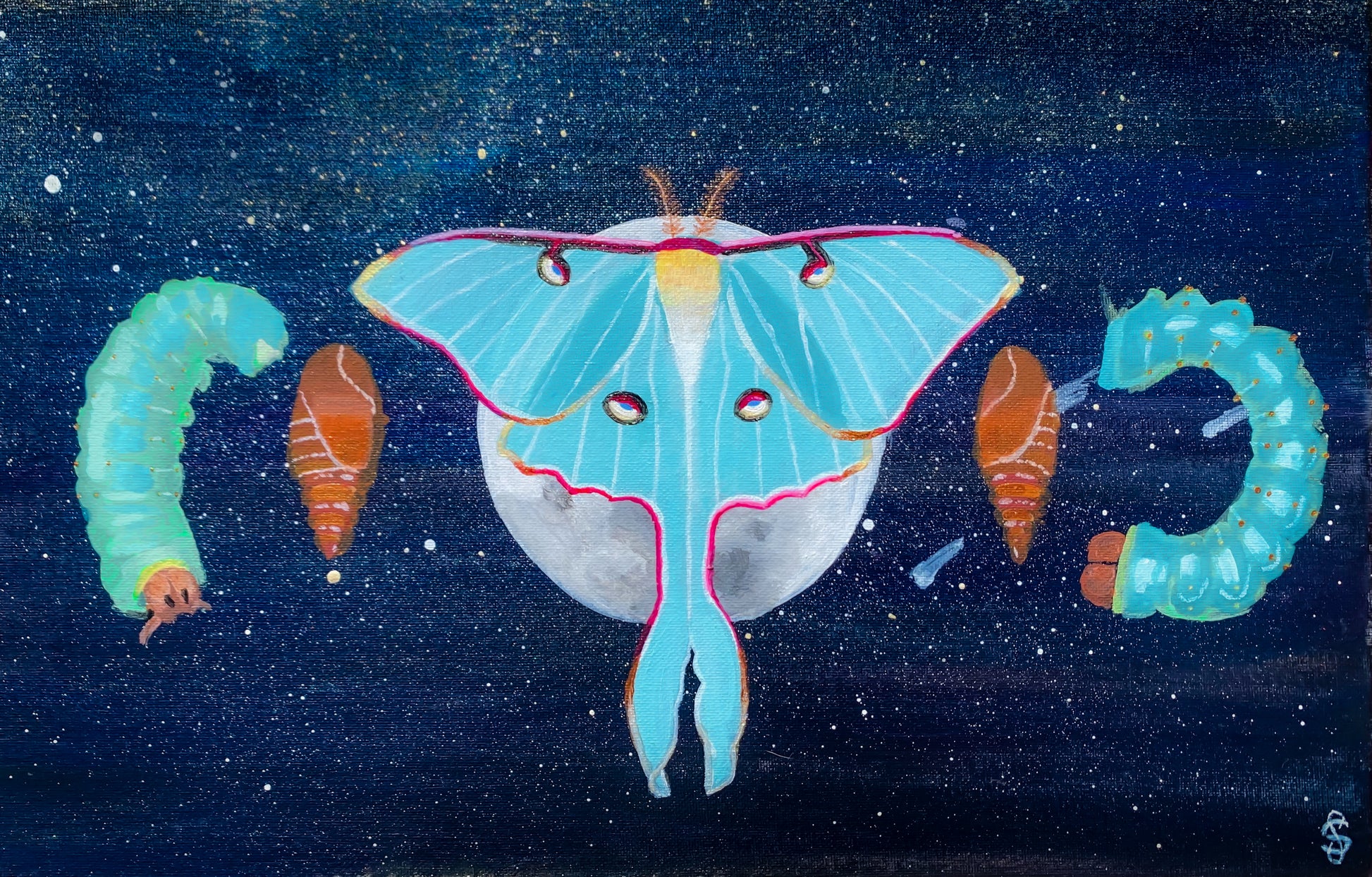 2020. acrylic on 11x17 inch canvas. this piece was inspired by my love for the moon and fascination with luna moths. this painting is the perfect representation of my love for the cosmos & divine feminine.
