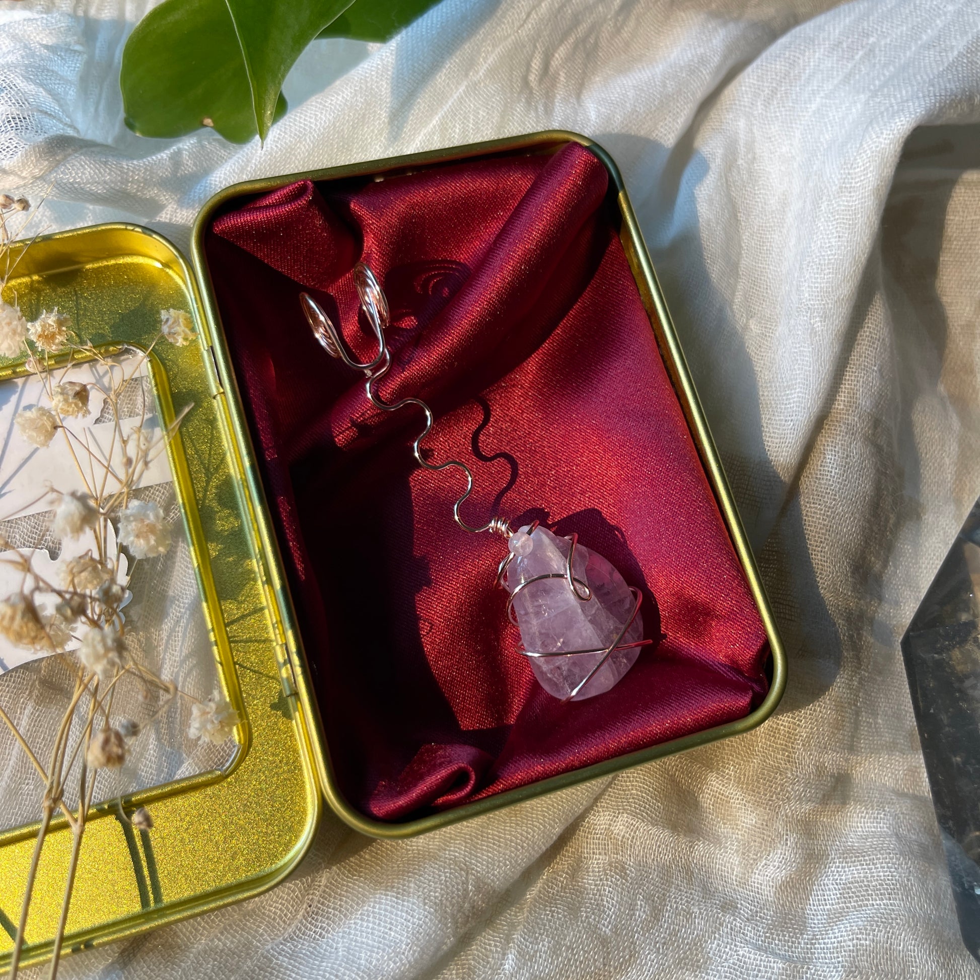 one of a kind high quality rare purple fluorite & morganite accent bead wrapped in tarnish resistant rose gold wire. each joint holder is fully adjustable to fit j's and blunts of any size. pairing your sessions with this crystal will bring forth its calming, protective, and intuition boosting properties. each j holder comes with a hand crafted satin-lined tin so you can stash your j's and holders together on all your adventures