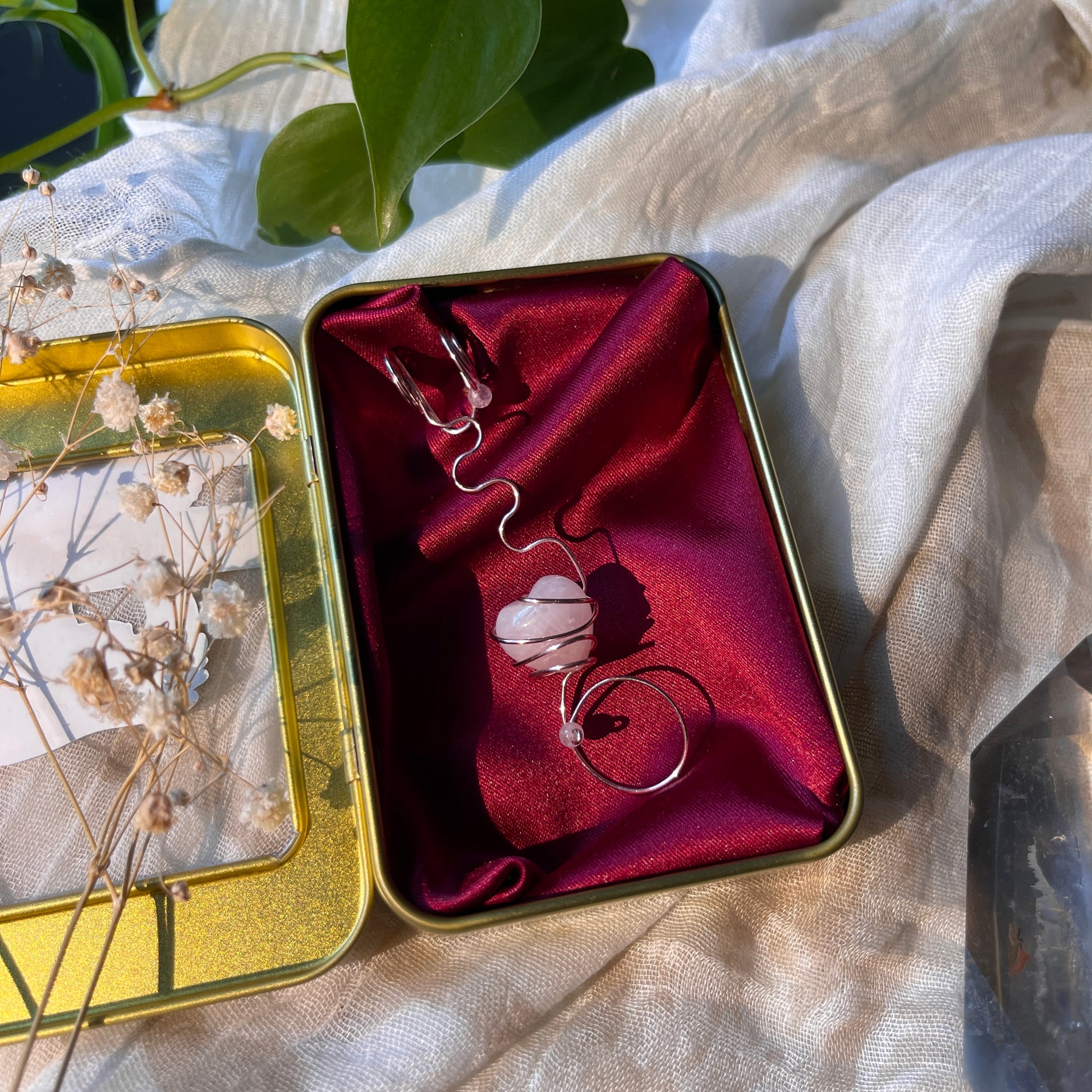 one of a kind high quality gemmy rose quartz heart wrapped in tarnish resistant rose gold wire. ring is fully adjustable to fit sizes 5-12. pairing your highs with this stunning rose quartz will bring forth its properties of self love, acceptance, and emotional healing. each j holder comes with a hand crafted satin-lined tin so you can stash your j's and holders together on all your adventures
