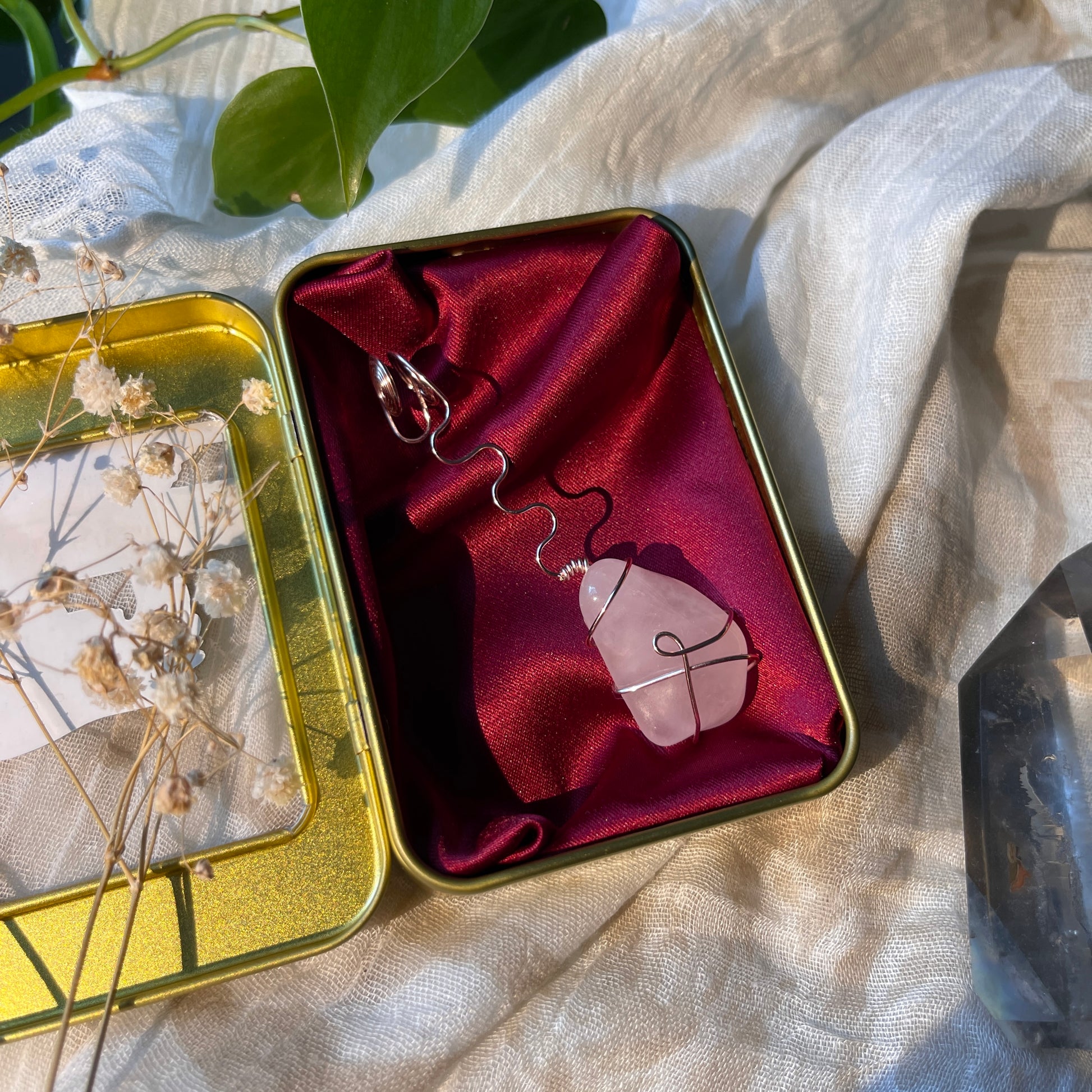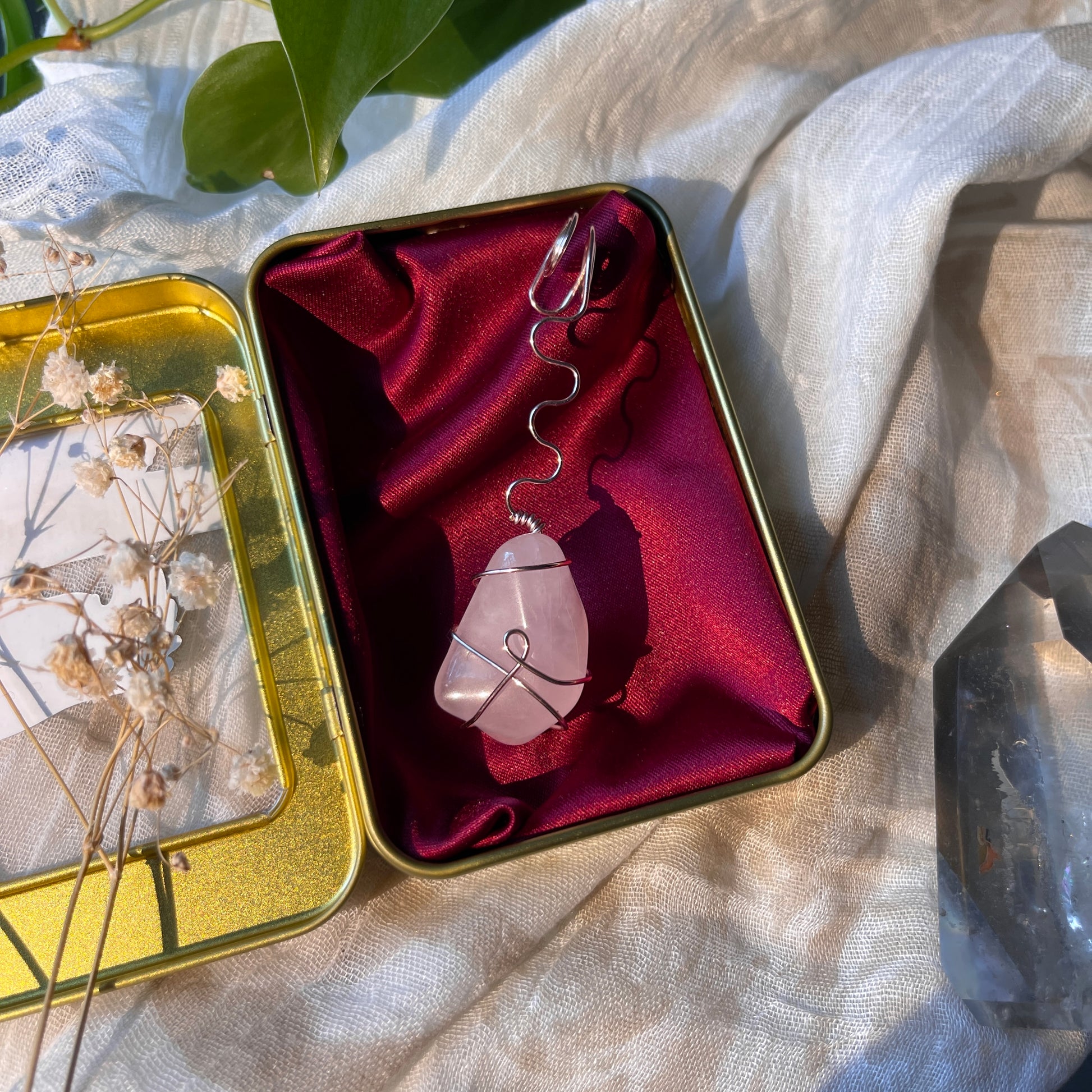 one of a kind high quality rose quartz tumble wrapped in tarnish resistant rose gold wire. each joint holder is fully adjustable to fit j's and blunts of any size. pairing your highs with this stunning rose quartz will bring forth its properties of self love, acceptance, and emotional healing. each j holder comes with a hand crafted satin-lined tin so you can stash your j's and holders together on all your adventures