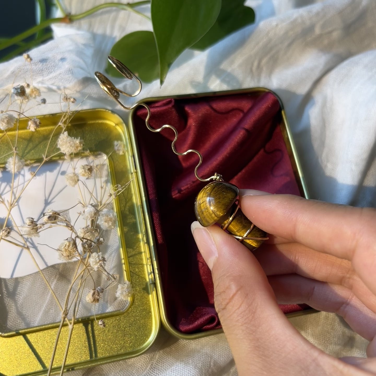 one of a kind tiger's eye mushroom wrapped in tarnish resistant gold wire. each joint holder is fully adjustable to fit j's and blunts of any size. pairing your sessions with this tiger's eye will bring forth its properties of abundance, creativity, and grounding. adjustable j holders can be used to fit joints & blunts alike. each j holder comes with a hand crafted satin-lined tin so you can stash your j's and holders together on all your adventures